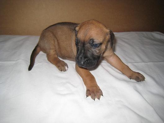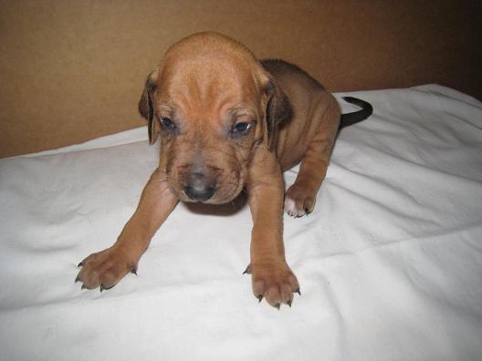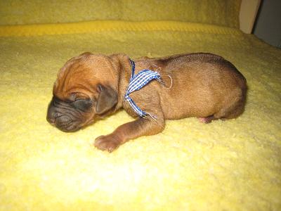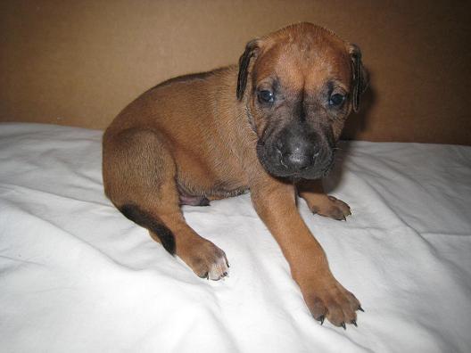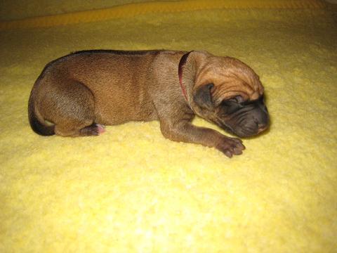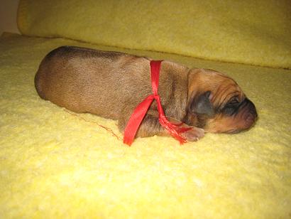 Nebojácný hravý pejsek, s úžasným tmavým čumáčkem. Má kratší ridge, proto se hezky hladí po zádech.